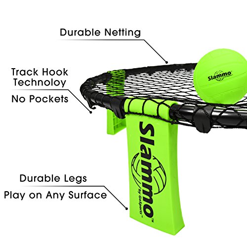 WHAT IS SLAMMO: Slammo is an action packed 2 on 2 volleyball style outdoor game; Teams have 3 hits to bounce or spike the ball to the net fun for family and friends out on the yard, at the beach, cookouts, camping, and more